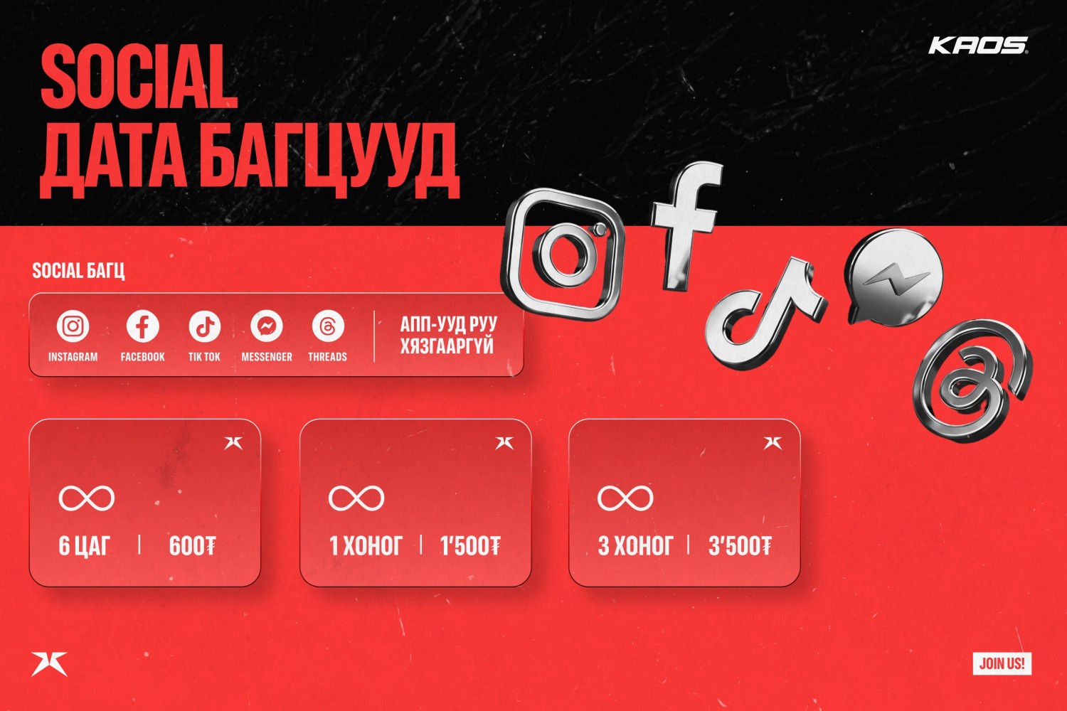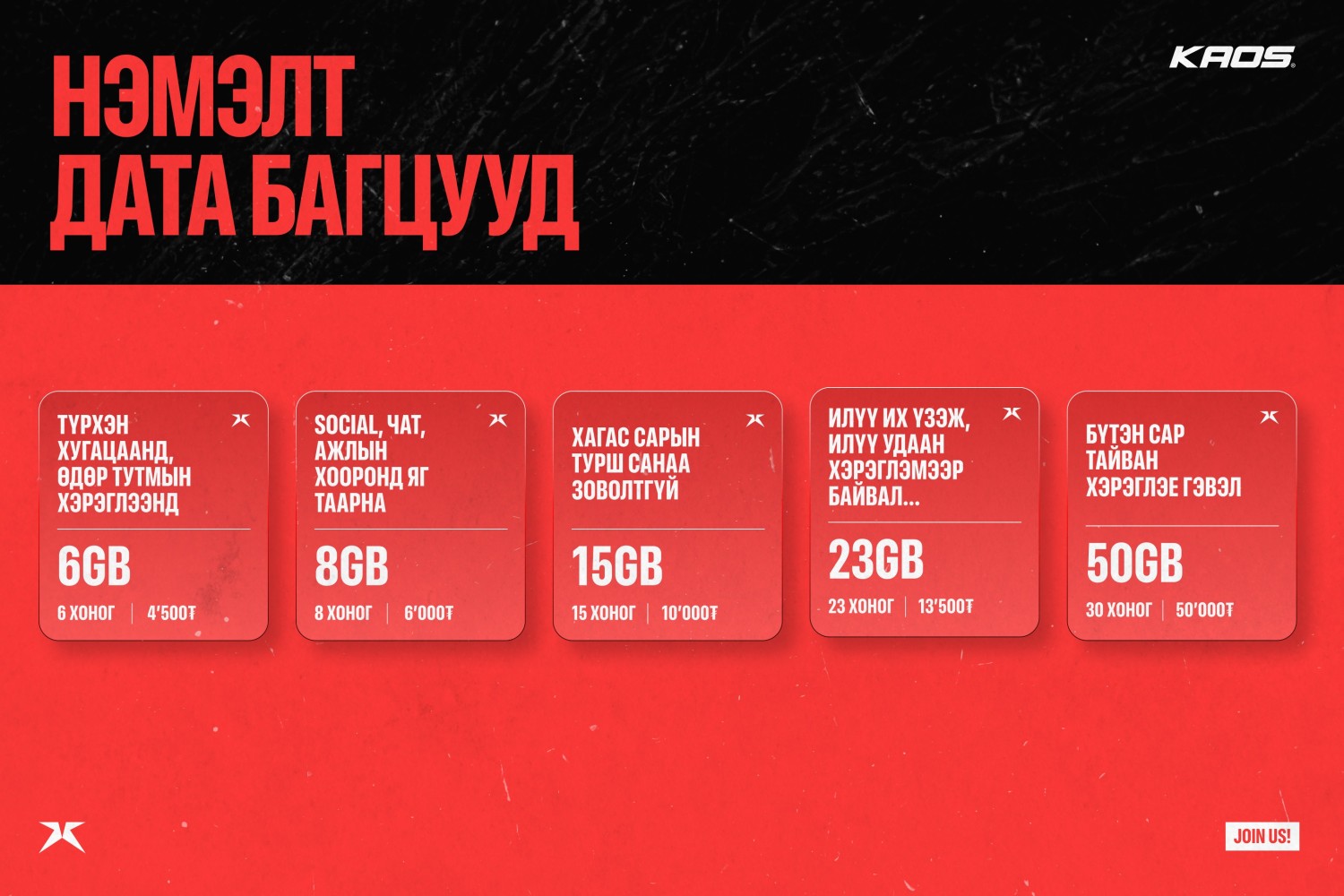 KAOS бол 505-тай дугаар. 0 суурь хураамжтай дараа төлбөртийн шинэ хэлбэр. 128kbps хурдны хязгааргүй эрхтэй цоо шинэ энэхүү дугаар чиний ID болох юм. ID-аа ашиглан “hottest offer”-уудыг өөрийн болгоорой!