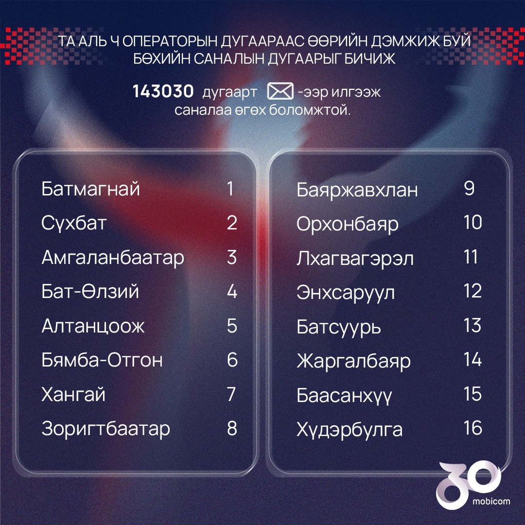 Мөн та аль ч операторын дугаараас өөрийн дэмжиж буй бөхийн саналын дугаарыг бичиж 143030 дугаарт SMS-ээр илгээж саналаа өгөх боломжтой.