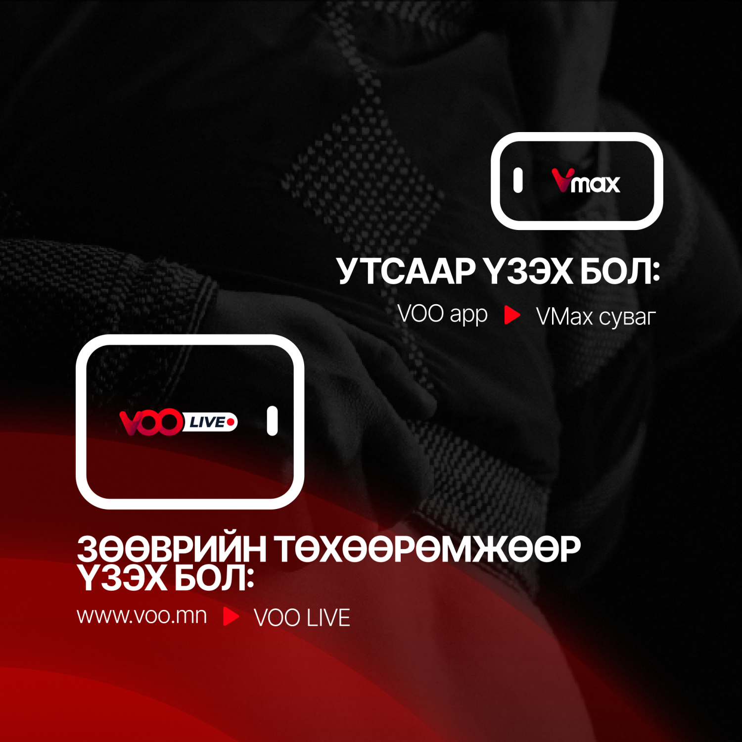 - Зурагтаар үзэх бол Smart TV дээрээ VOO smart TV апп-ыг суулган VOO LIVE -аас халз барилдааныг шууд үзээрэй.