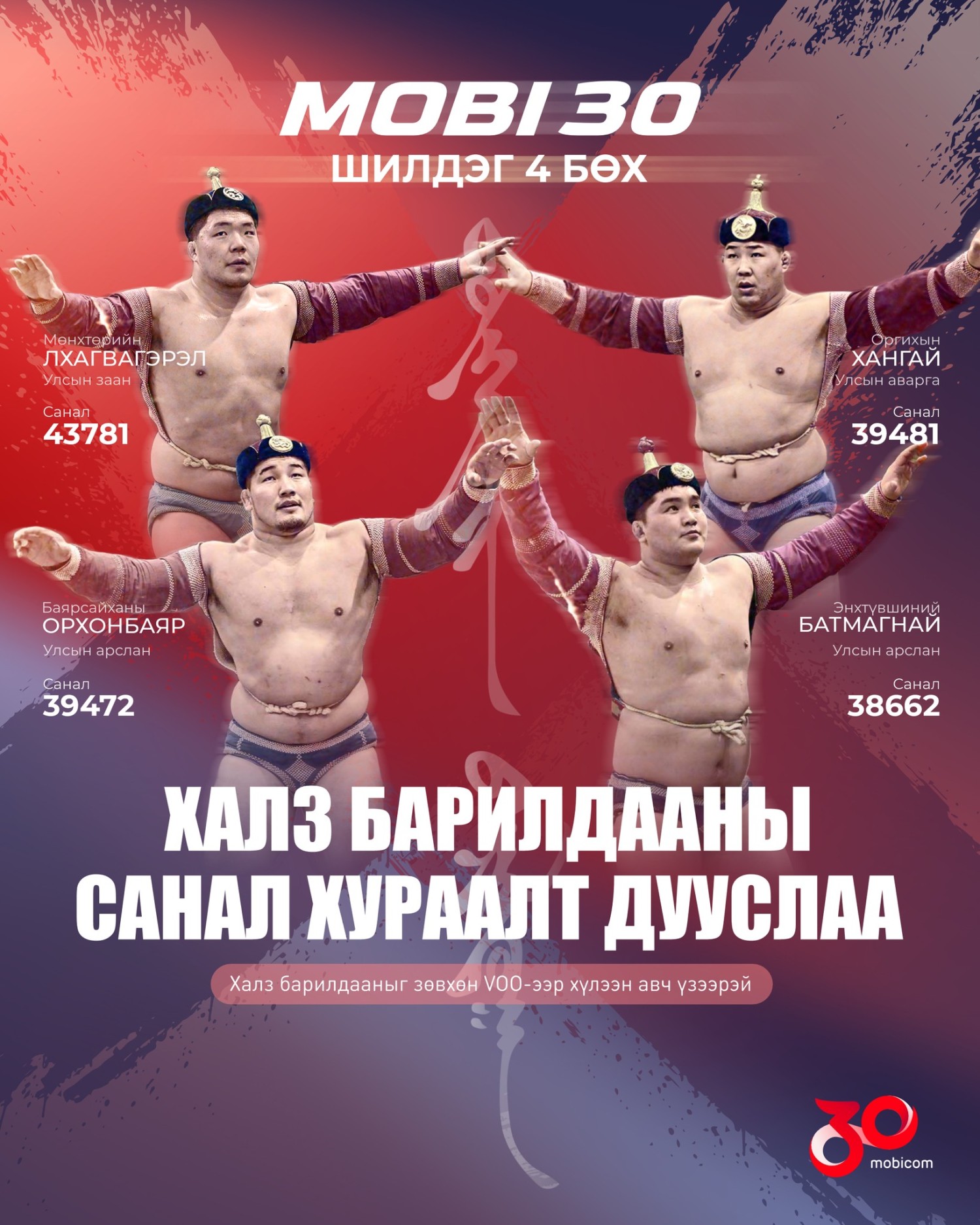 “Мобиком-30 жил” барилдаан хоёр үе шаттай. Эхнийх нь улс, аймгийн цолтой 128 бөхийн барилдаан. Удаах нь чансаа өндөр 16 бөхөөс хамгийн олон санал авсан дөрвөн бөхийн халз барилдаан.
