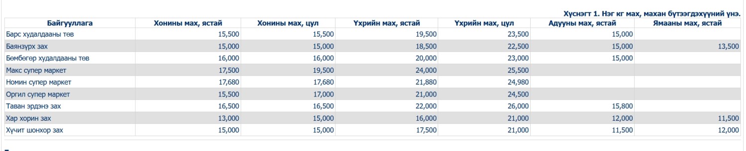 Нийслэлийн Статистикийн газраас 2025 оны аравдугаар сарын 27-ны өдөр нийслэлийн төвийн 6 дүүрэгт байрладаг 15 хүнсний зах, худалдааны төвд хийсэн үнийн судалгаатай харьцуулахад өнөөдрийн байдлаар махны үнэ буурсан үзүүлэлттэй байна.