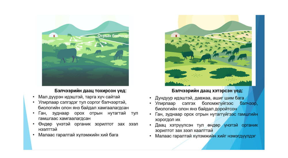1. Малын тоо хэд байвал бэлчээрийн даацад тохирох вэ гэдгээ мэдэж байвал малчид эрхбиш нэгийг бодно. Бэлчээрийг нийтээр дундаа ашиглаж байгаа үед энэ мэдээллийг малчинд өгөх нь бүү хэл, төр өөрөө ч мэдэхгүй байна. Одоо бэлчээрийн даацыг сумаар тогтоож буй нь жалгын нэг малчдад хүрч хөшүүрэг болж чадахгүй байна.