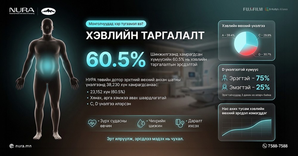Тэгвэл НУРА төвийн эрт илрүүлгийн төвд шинжилгээнд хамрагдсан 41 мянган гаруй үйлчлүүлэгчийн 23,971 буюу 60.4 хувьд дотор өөхлөлт ихтэй гарчээ. Эдгээр дунд эрчүүдэд дотор өөхлөлт эмэгтэйчүүдтэй харьцуулахад гурав дахин их байгаа нь монгол эрчүүд дээр дурдсан өвчнүүдэд өртөх эрсдэл төдий чинээ их байгааг анхаарах цаг болжээ.